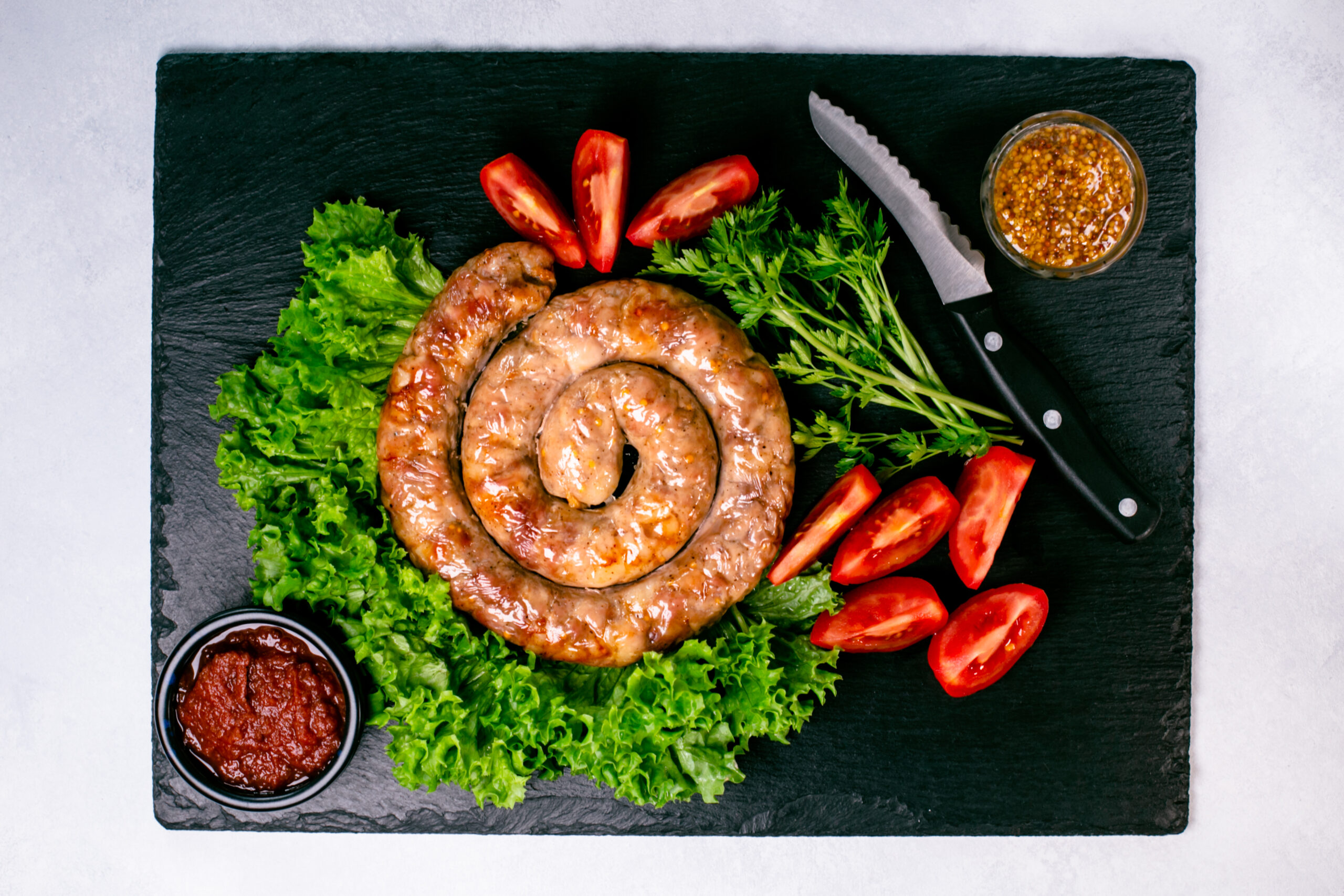 Preparation recommendation: Thaw the sausage in the fridge, in the oven or in the microwave using the 'Defrost' function. Then fry in vegetable oil or animal fat in a preheated pan (with lid) over low heat, turning regularly. Alternatively, bake in a preheated oven at 180°C for about 20-30 minutes. Do not refreeze.