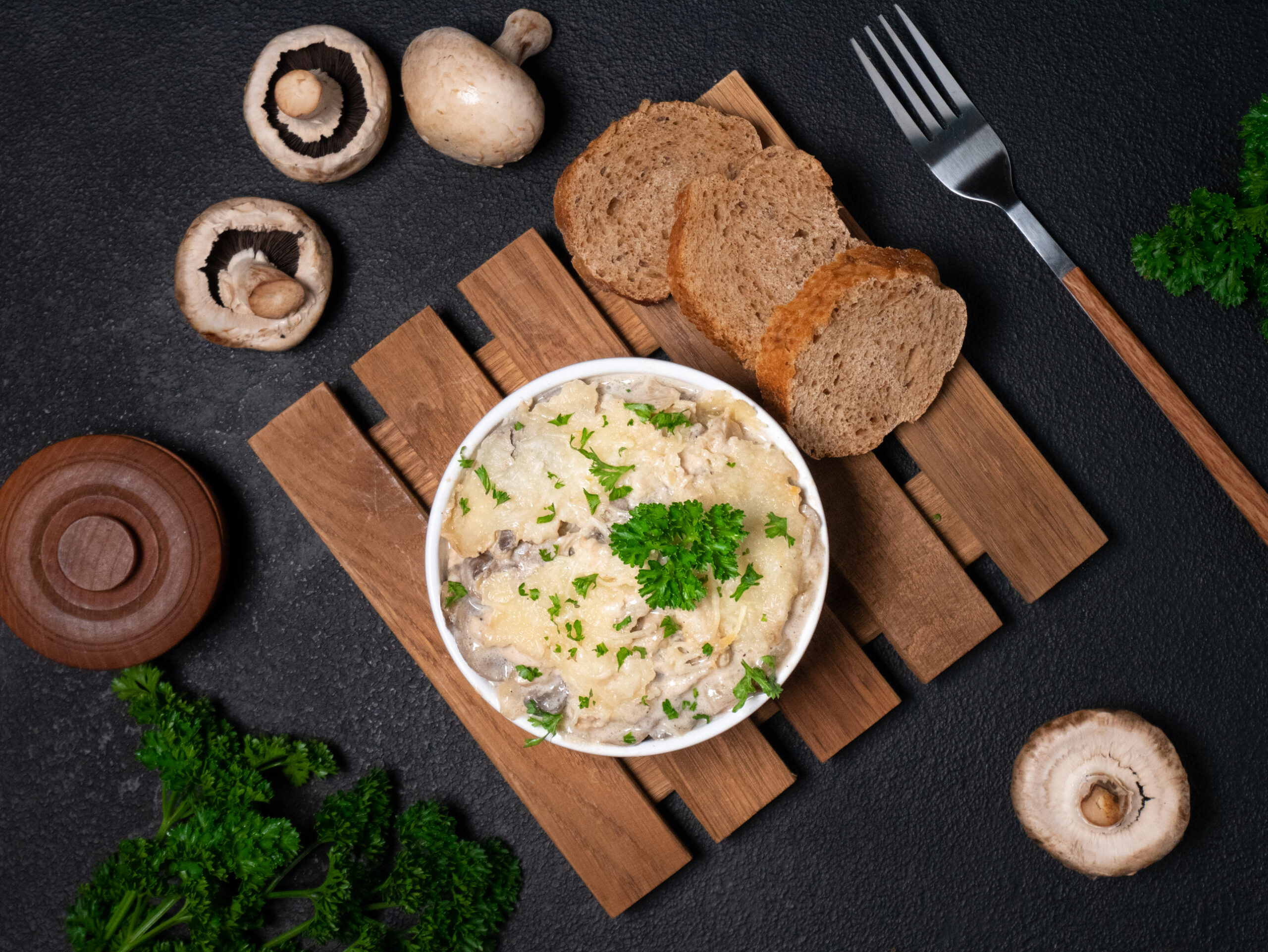 Price range: 12,40 € through 13,17 €Julienne with chicken and mushrooms